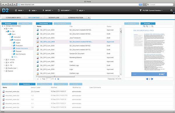 EMC bought D2 back in 2012. The first image is their earlier design for the product. OpenText purchased D2 from EMC and revamped it a bit.