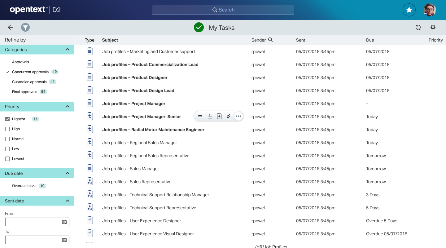 OpenText grows through acquisitions. This means there a number of products with very different user experience and a very loyal customer base. The challenge was integrating the D2 application into OpenText suite of products so it feels like it's part of one family. At the same time, we should not move too far away from original D2 workflow and experience or we risk losing customers or alienating them. A delicate balance.